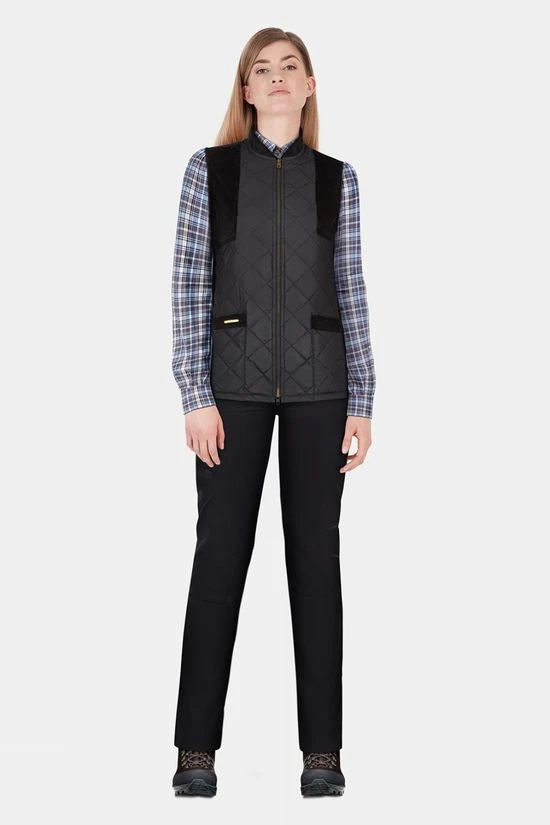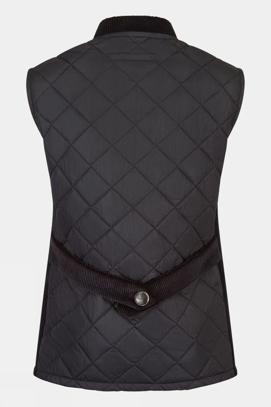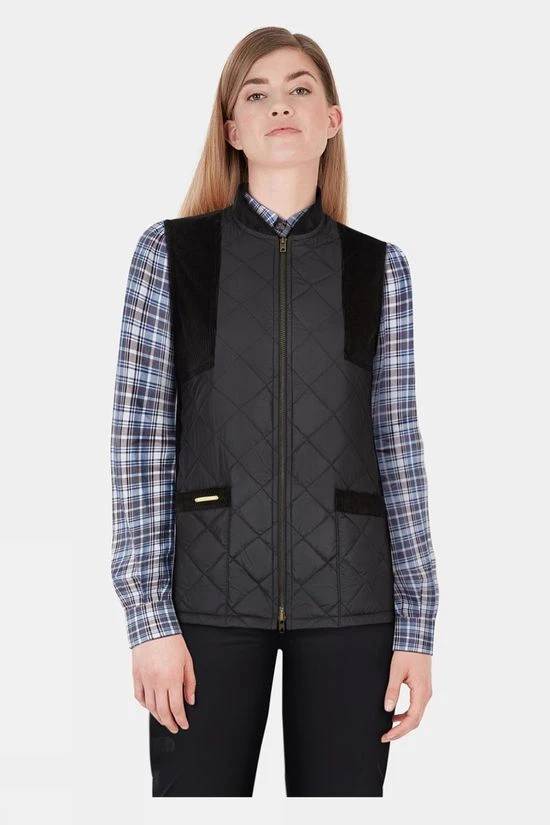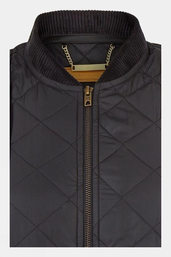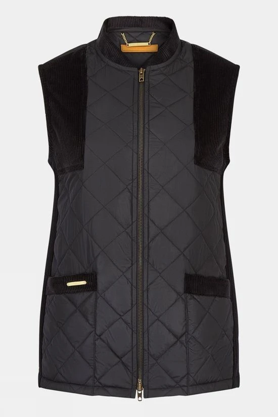 A chic update on the classic Quilted Gilet by Troy London, with gold highlights in the two-way zip, neck chain and TROY branded pocket bar. Soft cotton corduroy shoulder and pocket patches and stretch side panels provide added comfort and soften the sleek quilted exterior.
